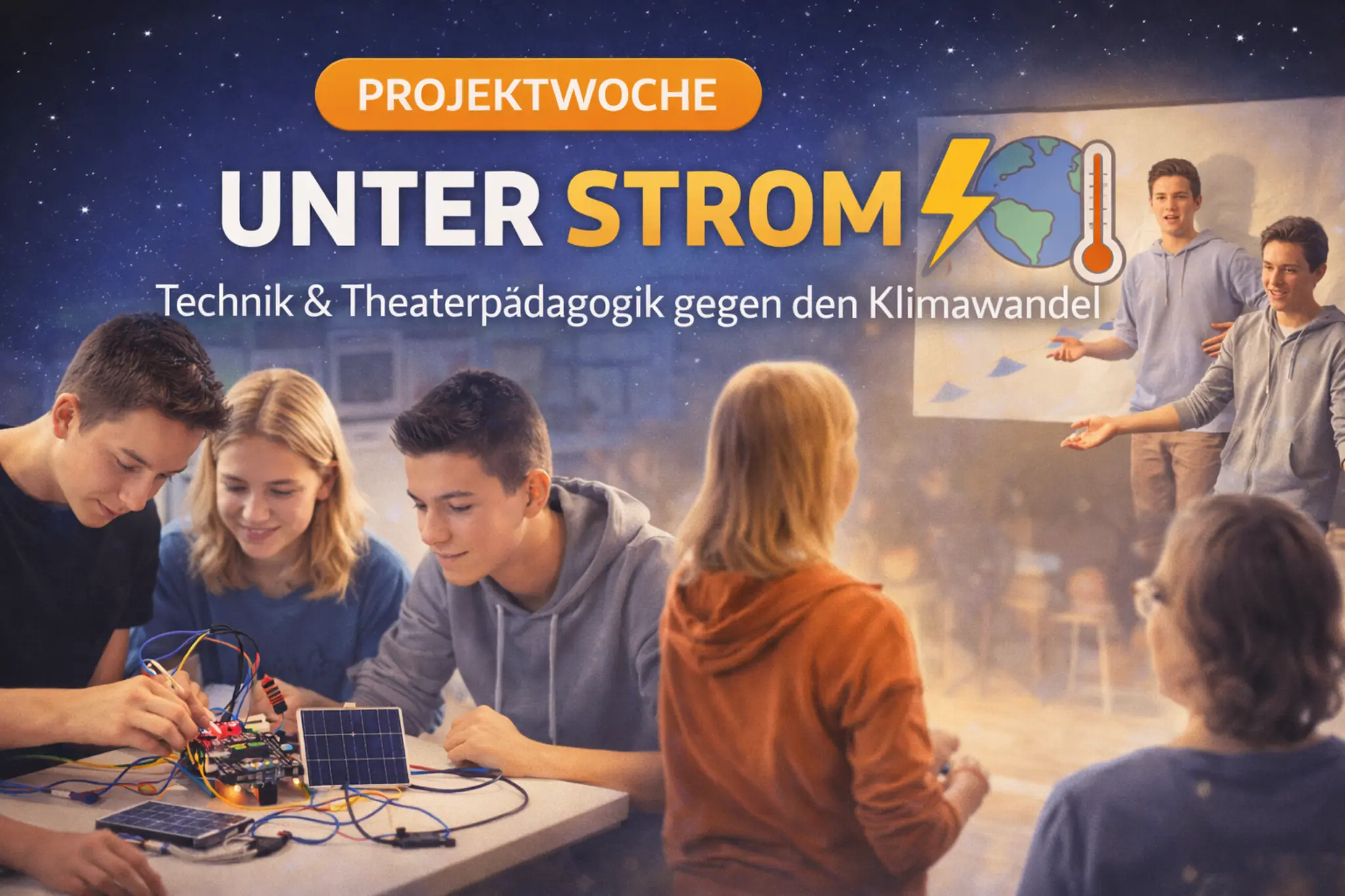 Vom 9. bis 13. Februar 2026 verband die Klasse F1 in der Projektwoche „Unter Strom“ nachhaltige Technik mit Theaterpädagogik. In Kooperation mit dem Verein UNTER STROM entwickelten die Schüler:innen solarbetriebene Microcontroller und integrierten diese in kreative Bühnenstücke zum Klimawandel. Ein besonderes Augenmerk lag dabei auf der Berufsorientierung und der Förderung von Zukunftskompetenzen.